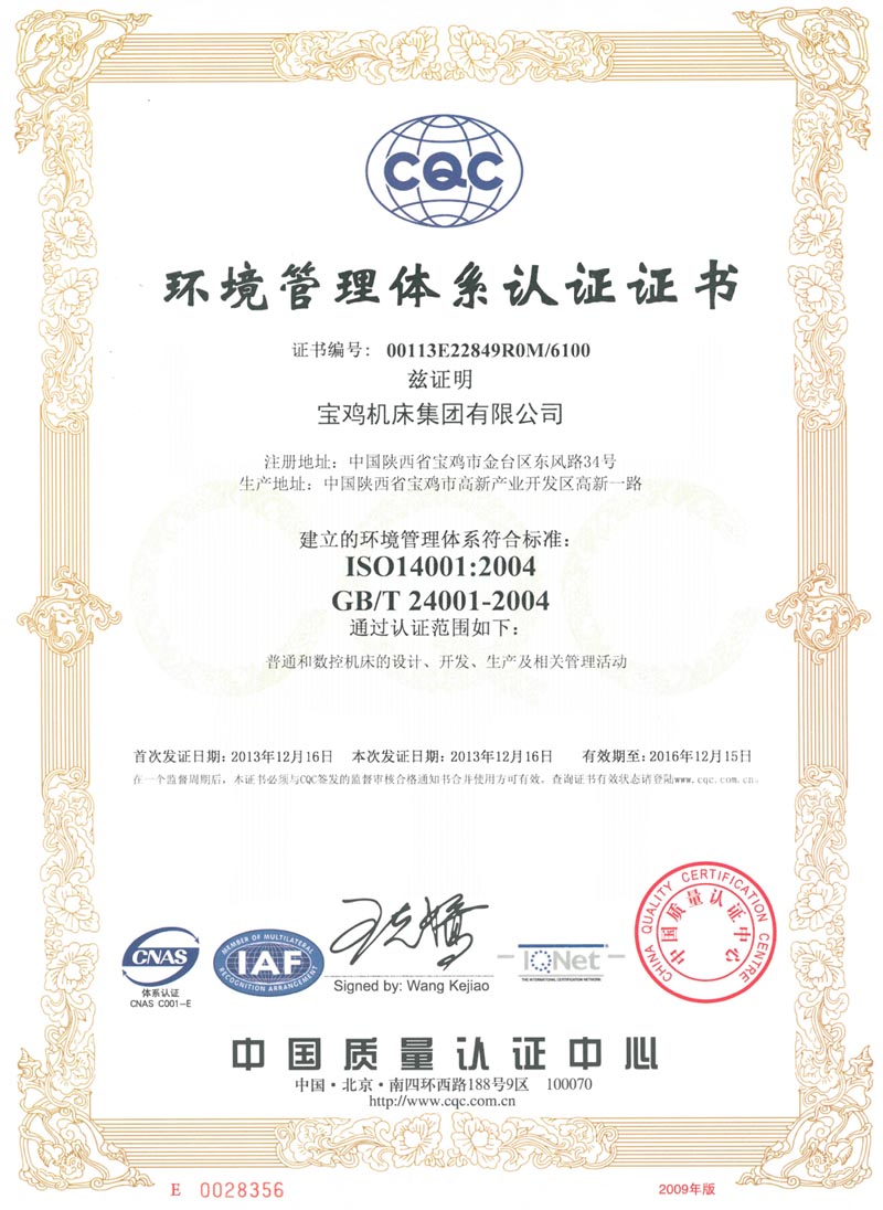環(huán)境管理體系認(rèn)證證書